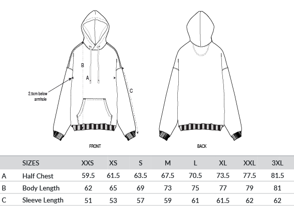 Set-in sleeve. Double-layered hood in self-fabric. Flat drawcords in matching body colour. Embroidered eyelets. Double-needle topstitch on all seams. 2x1 ribs at sleeve cuffs and bottom hem. Kangaroo pocket at front. Inside herringbone back neck tape. Self-fabric half moon at back neck.